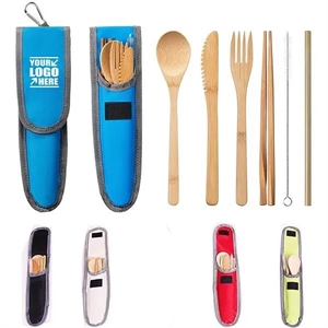 Go eco-friendly with our bamboo travel utensil set, resistant to stains and flavor absorption, and dishwasher safe for easy cleaning. This lightweight set includes a fork, corrugated knife, spoon, two chopsticks, a straw with a cleaning brush, and a washable carry bag with a carabiner. The secure hook-and-loop closure keeps utensils tidy on the go. Pouch dimensions: 9" x 2". Personalize with your company logo for a sustainable branding choice.