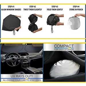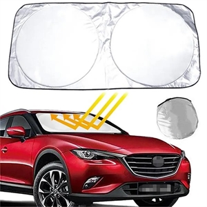 Protect your car's interior from UV rays with our folding sun shield. Made of reflective polyester, it keeps your vehicle cool and prevents damage. Easy to use and store, it pops open in seconds and comes with a pouch. Its double shade design fits most windshields, ideal for car dealers and summer events. Size: 59" L x 27 1/2" W.
