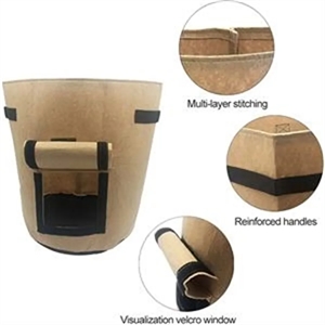 This grow bag is made from PET and non-woven fabric, offering a breathable environment that encourages healthy root growth and efficient water drainage, outperforming traditional plastic containers. Durable and reusable, it's designed for long-term use. Size: 12" Diameter x 14" H.