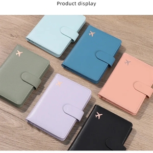 This passport holder, at 5.6" high and 4.2" wide, features a premium synthetic leather exterior and interior for a comfortable feel and protection against dust and abrasions. Its slim, lightweight design doesn't add bulk. It includes RFID Blocking to safeguard personal information, practical slots for a passport, cards, and boarding passes, and offers easy access during transit. It secures with a magnetic closure and includes a ball pen as a free gift.
