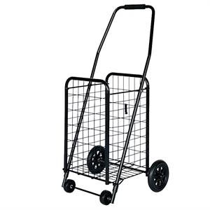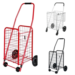 Introducing our high-quality shopping trolley, made from durable steel with universal wheels for effortless maneuverability. No assembly required, this foldable cart is perfect for easy and convenient shopping. Lightweight yet sturdy, it can carry items up to 66 lbs. The cart is engineered to fold flat, saving valuable space in your home. Crafted with premium metal materials, it withstands tough wear and tear. With 360-degree swivel wheels in the front and 7" snap-on wheels in the back, it offers smooth direction changes. Snap the back wheels on or off for quick use and storage. The ideal solution for versatile and hassle-free shopping. Dimensions: 36 1/4"L x 21 5/8"W.