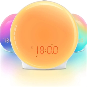 Rise and shine with our Sunrise Alarm Clock! Ideal for kids, heavy sleepers, and bedrooms, it features sunrise simulation, sleep aid, dual alarms, FM radio, snooze, nightlight, and 7 natural sounds. The 7-color display enhances the wake-up experience. A thoughtful gift at 5"x 7.2" x 7.2", it comes with a button battery included. Wake up rejuvenated and ready for the day!